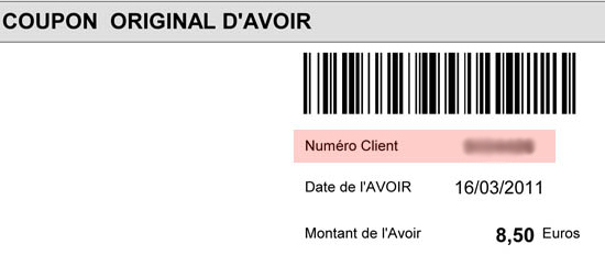 Votre numéro client est présent sur votre coupon d'avoir (voir ci-dessous).