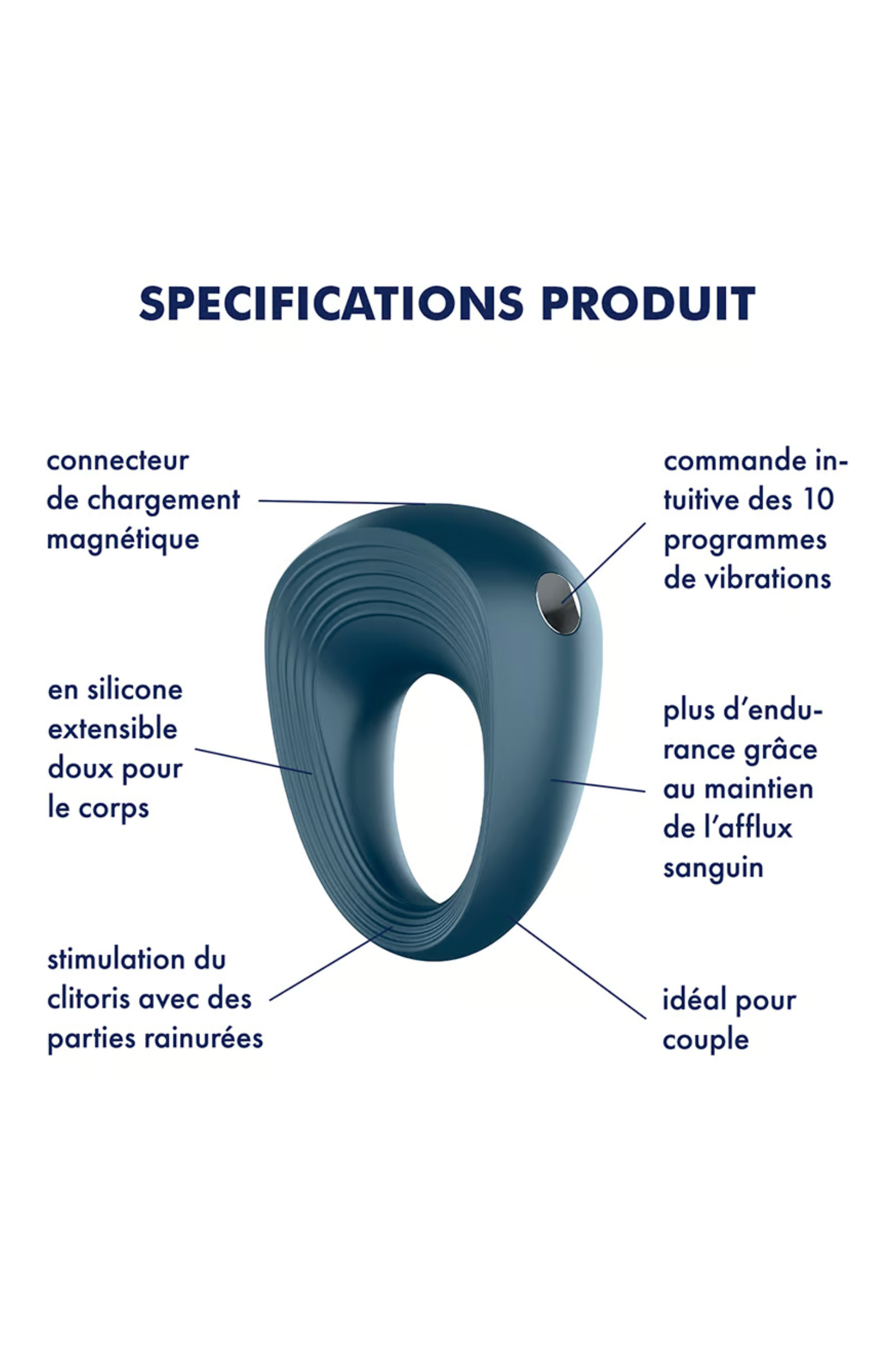 Le Satisfyer Power Ring est un anneau pénien vibrant. Il est conçu pour raffermir l'érection et stimuler le clitoris de votre partenaire lors de la pénétration, grâce à ses 10 programmes vibrants.