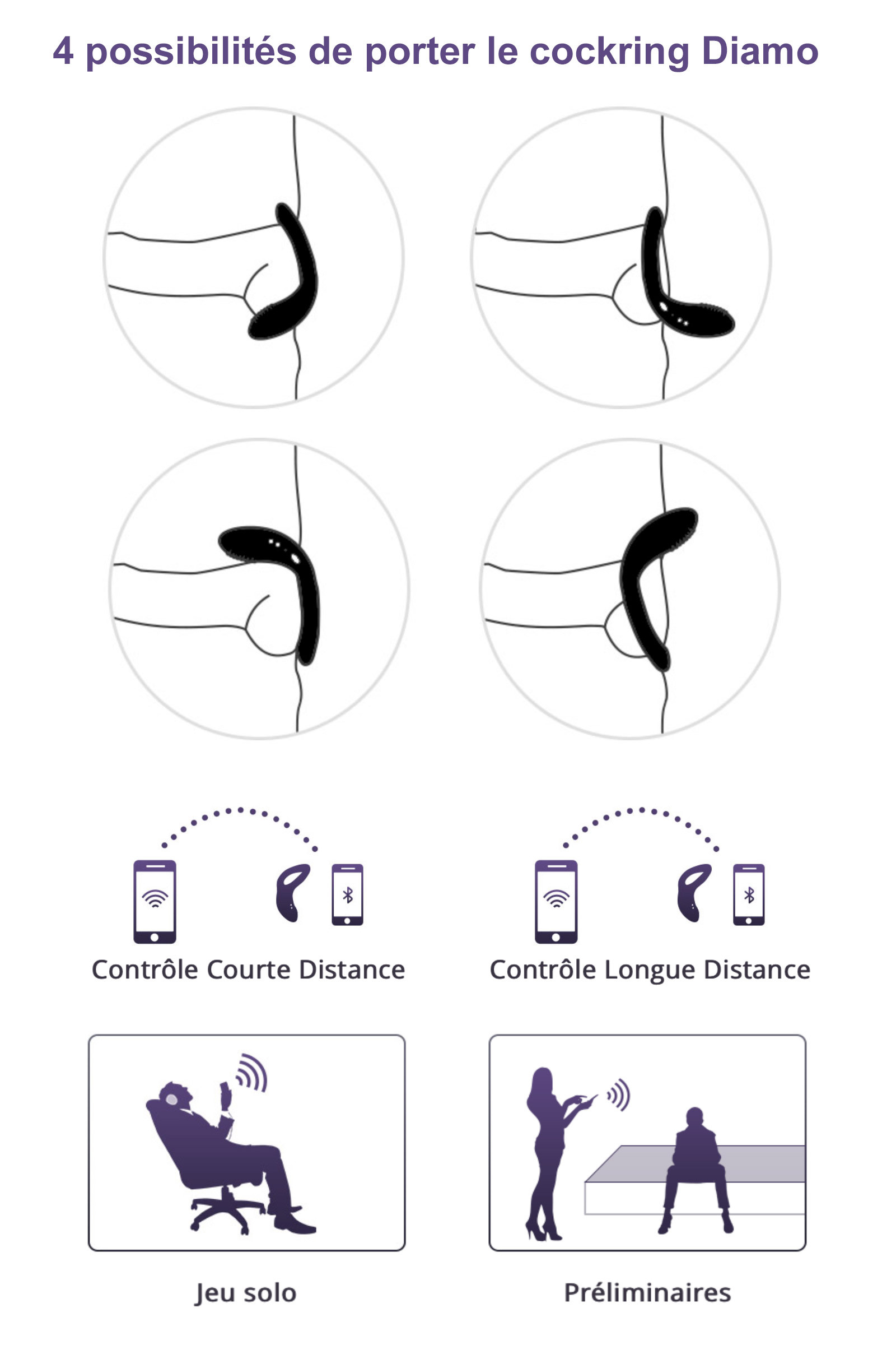 Plusieurs façons de porter le cockring vibrant Diamo, à chaque position une nouvelle sensation, que ce soit seul ou en couple.