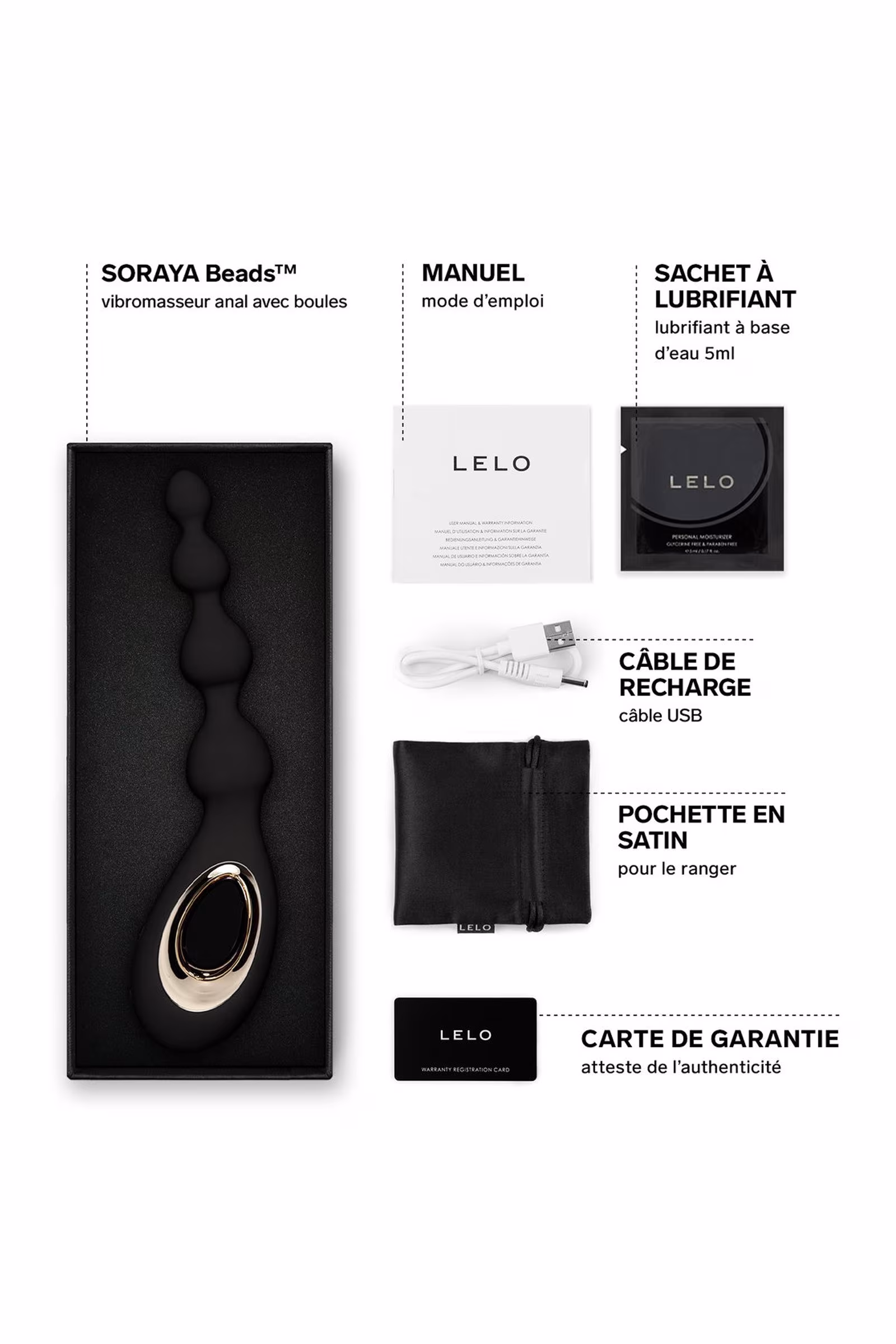 SORAYA Beads™ de la marque Lelo est un vibromasseur avec boules conçu pour les femmes et les hommes qui souhaitent découvrir l’univers de la stimulation anale. Très facile d’utilisation et doté d’une conception unique, ce chapelet anal vibrant s’insère une boule après l’autre pour stimuler les terminaisons nerveuses situées à l’intérieur et autour de l’anus.