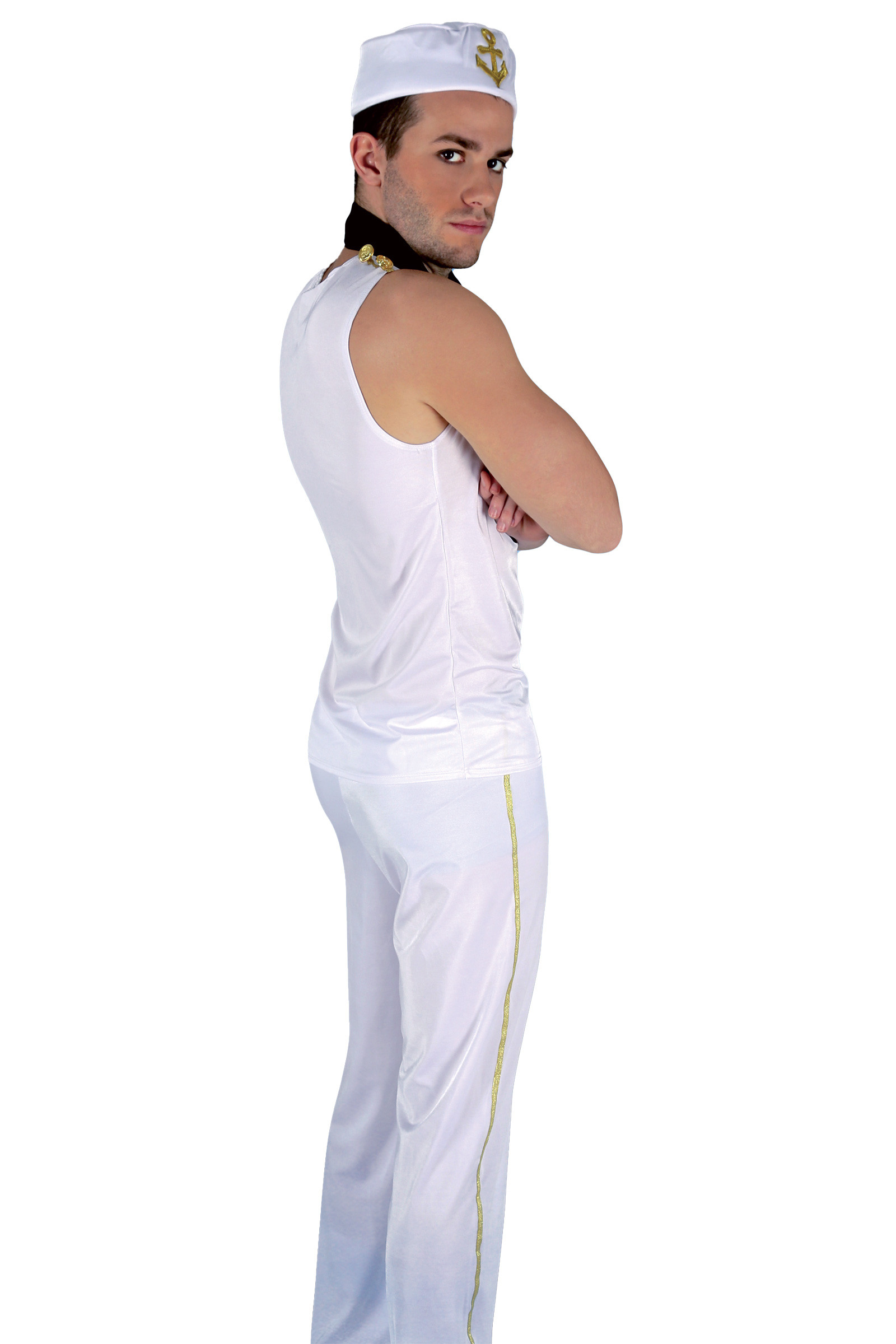 Un ensemble marin sexy pour homme, pour jouer les matelots chics : un pantalon taille élastiquée avec ruban cousu doré sur chaque jambe, blouse coordonnée avec bouton dorés sur les épaules et écusson encre doré brodée sur la poitrine. Le petit béret est garni de mousse pour un maintien parfait et un bandeau noir satiné vous est offert pour couvrir les yeux de la personne que vous embarquerez à bord de votre traversée du plaisir.
