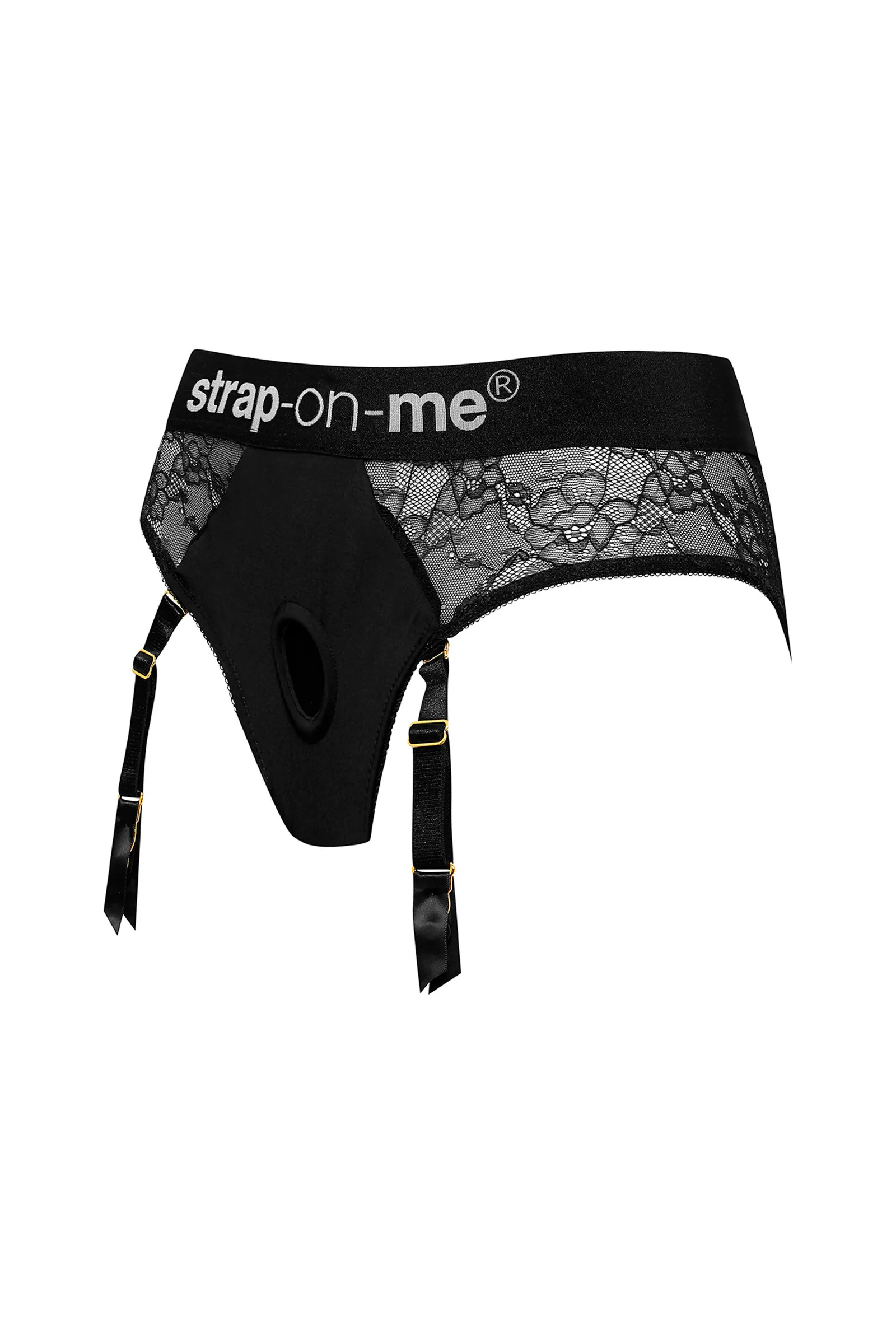 La particularité de ce modèle de culotte jarretelles très sexy est de pouvoir insérer un gode de la marque Strap-On-Me grâce à son encoche prévu à cet effet. Cette culotte jarretelles harnais en microfibre et dentelle est un harnais de gode ceinture avec sa ceinture extensible.