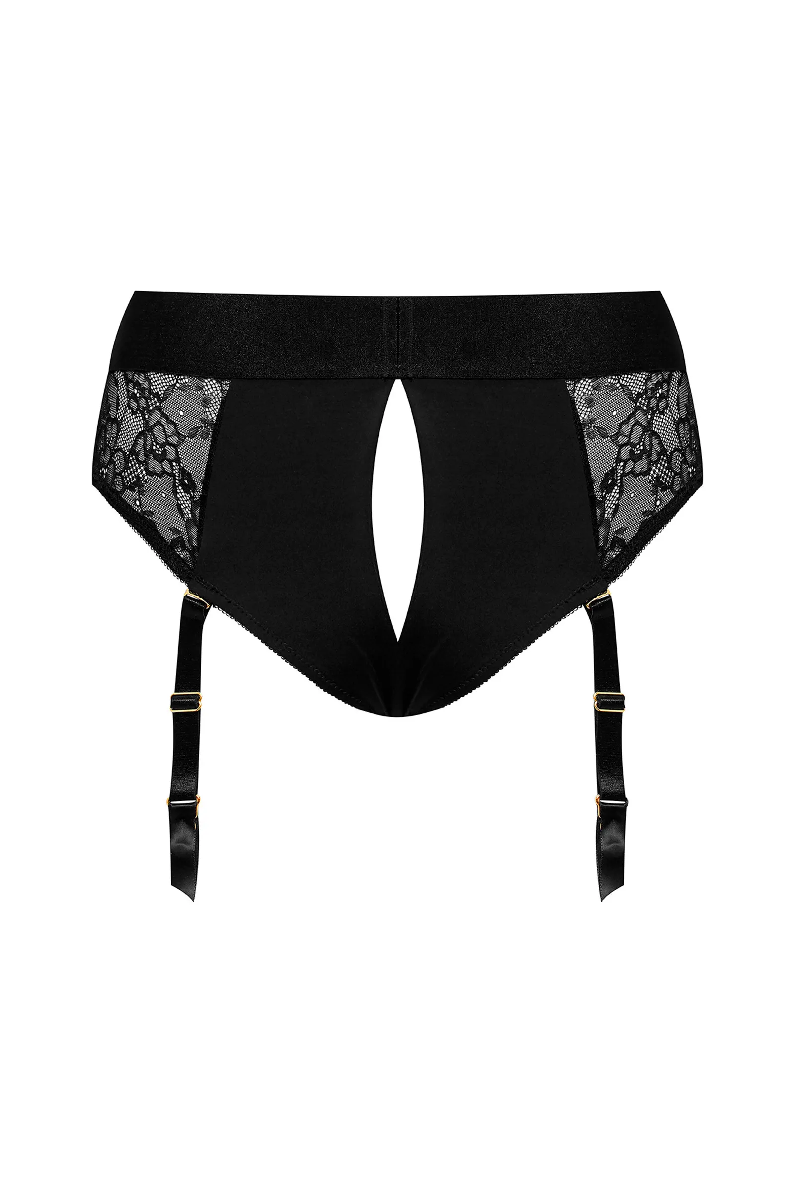 Culotte jarretelles sexy avec dentelle, avec emplacement godemichet et ouverte sur les fesses.