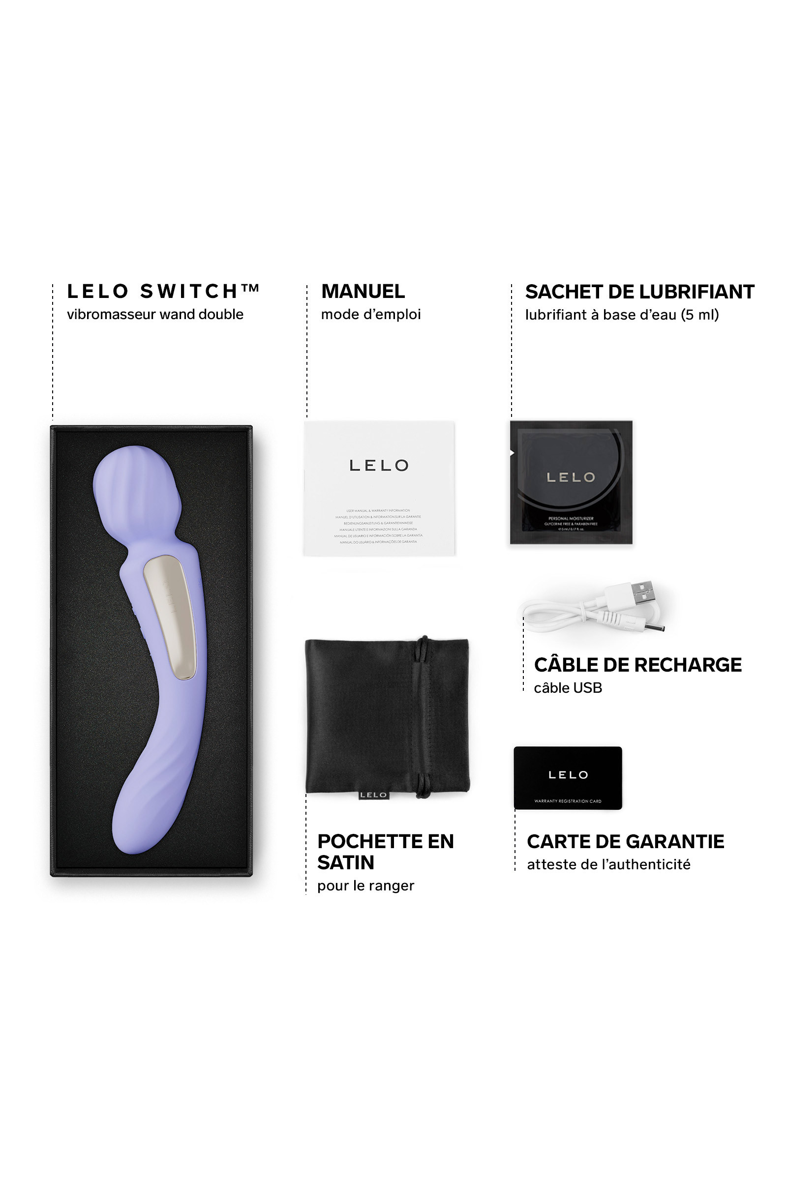 - Inclus : Vibromasseur LELO Switch™, câble de recharge USB, pochette satinée, carte de garantie, manuel d’utilisation, échantillon de lubrifiant LELO