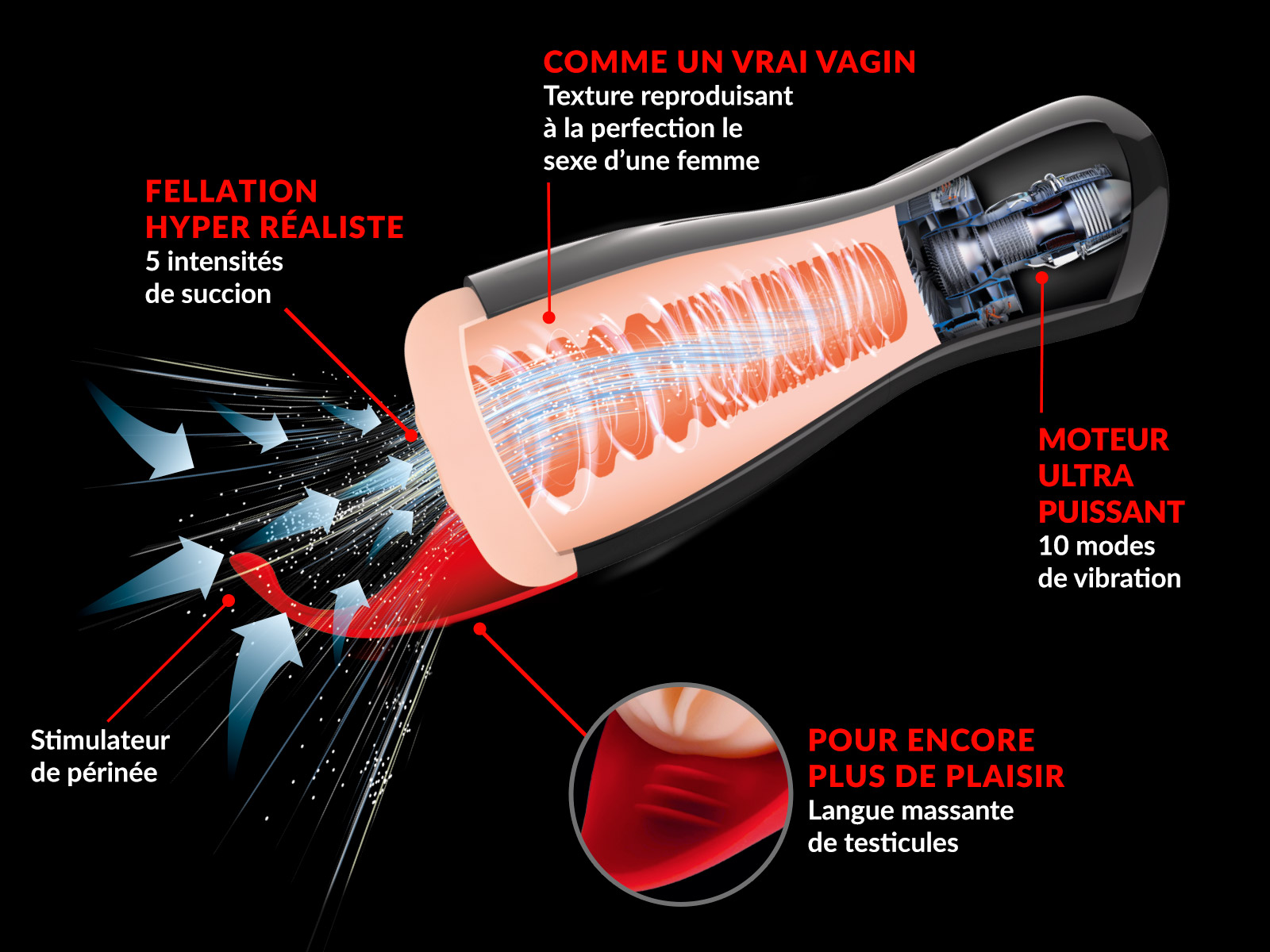 - Mode fellation : Grâce à son système d'électrovanne intégré, il reproduit à la perfection les sensations d'une fellation avec 5 intensités de succion.