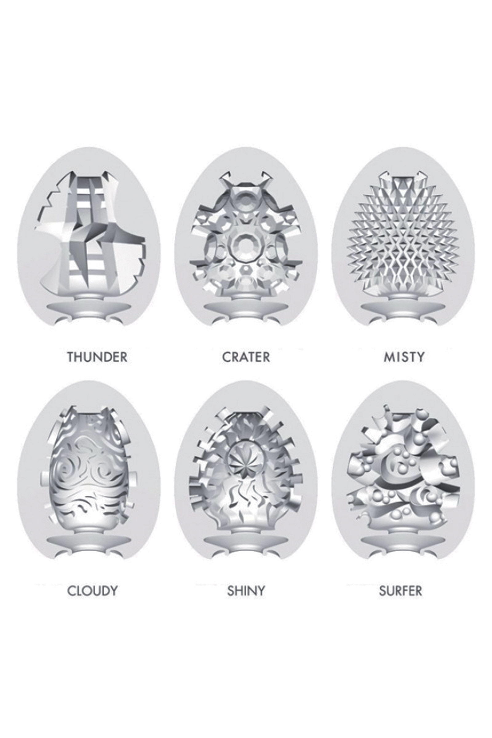 Packagés en barquette transparente, ces 6 masturbateurs Egg. Sortis de leur coquille semi rigide, chaque masturbateur se présente sous l’aspect d'une boule en forme d'oeuf, fendue et évidée afin d'y recevoir le pénis. En matière très extensible, la texture est tapissée intérieurement de 6 modèles de nervures stimulantes. A chaque type de nervure sa couleur : Thunder(vert), Misty (bleu), Cloudy (violet), Crater (brun), Sufer (Turqoise), Shiny (Orange). Lavable.