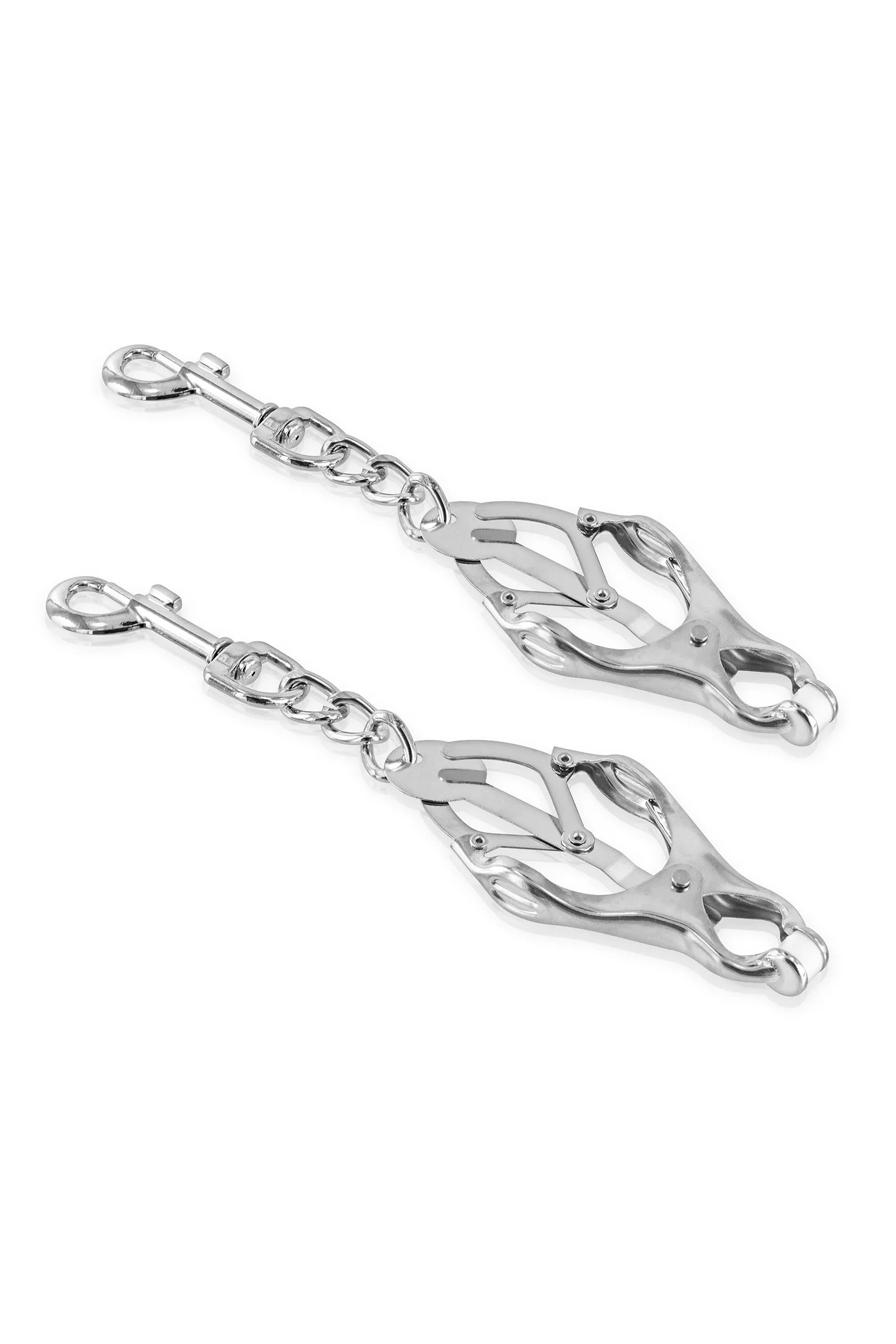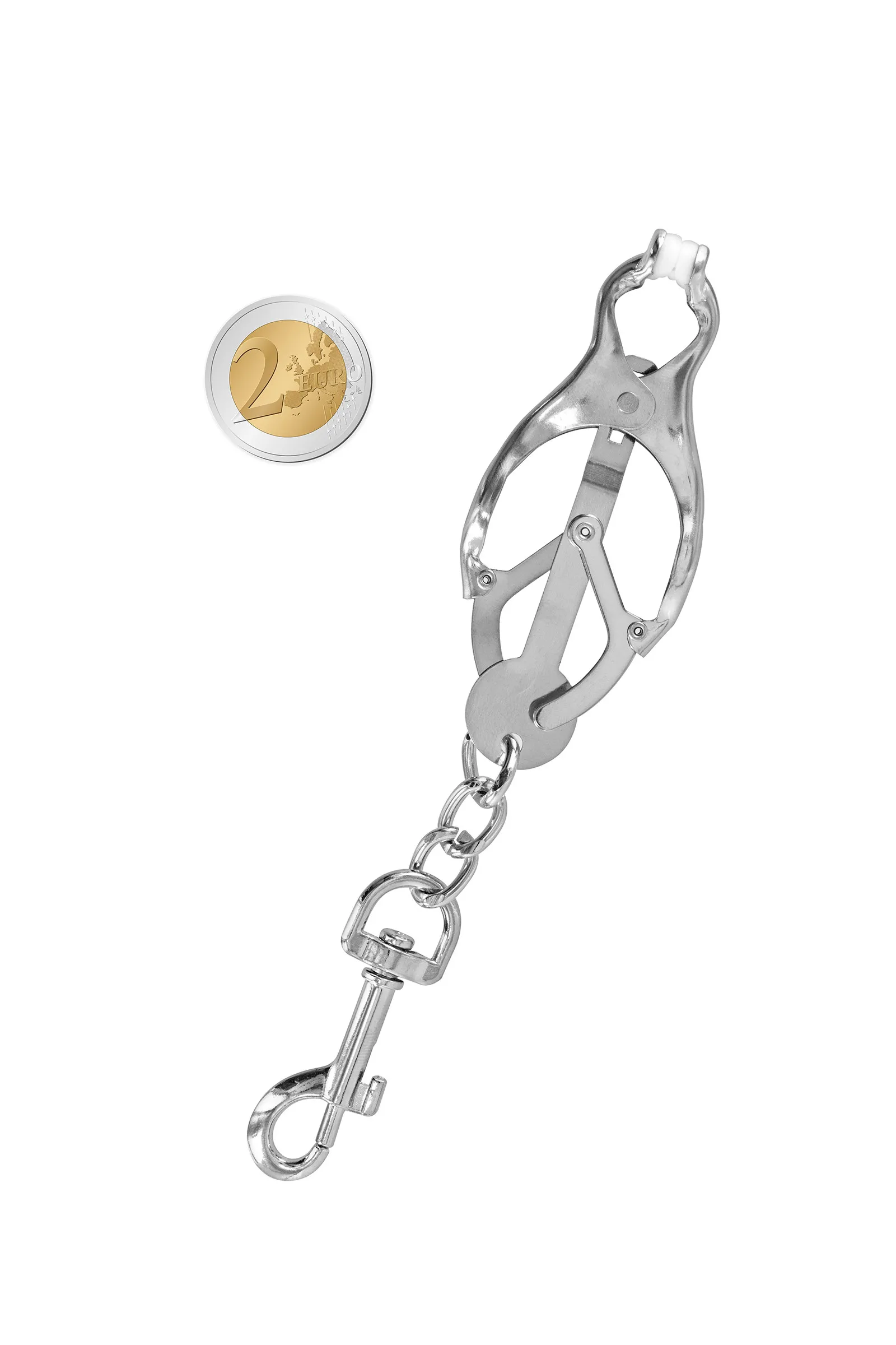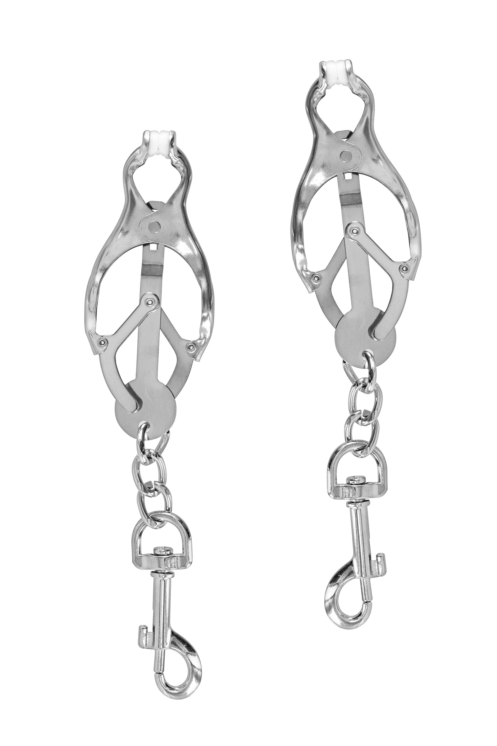 Voici une paire de pinces à seins en acier dotées de chaînes de lestage à mousquetons. Vous pourrez y accrocher des poids ou des chaînes de soumission. Plus le poids ou la traction sera importante plus la pression sur les tétons sera forte.