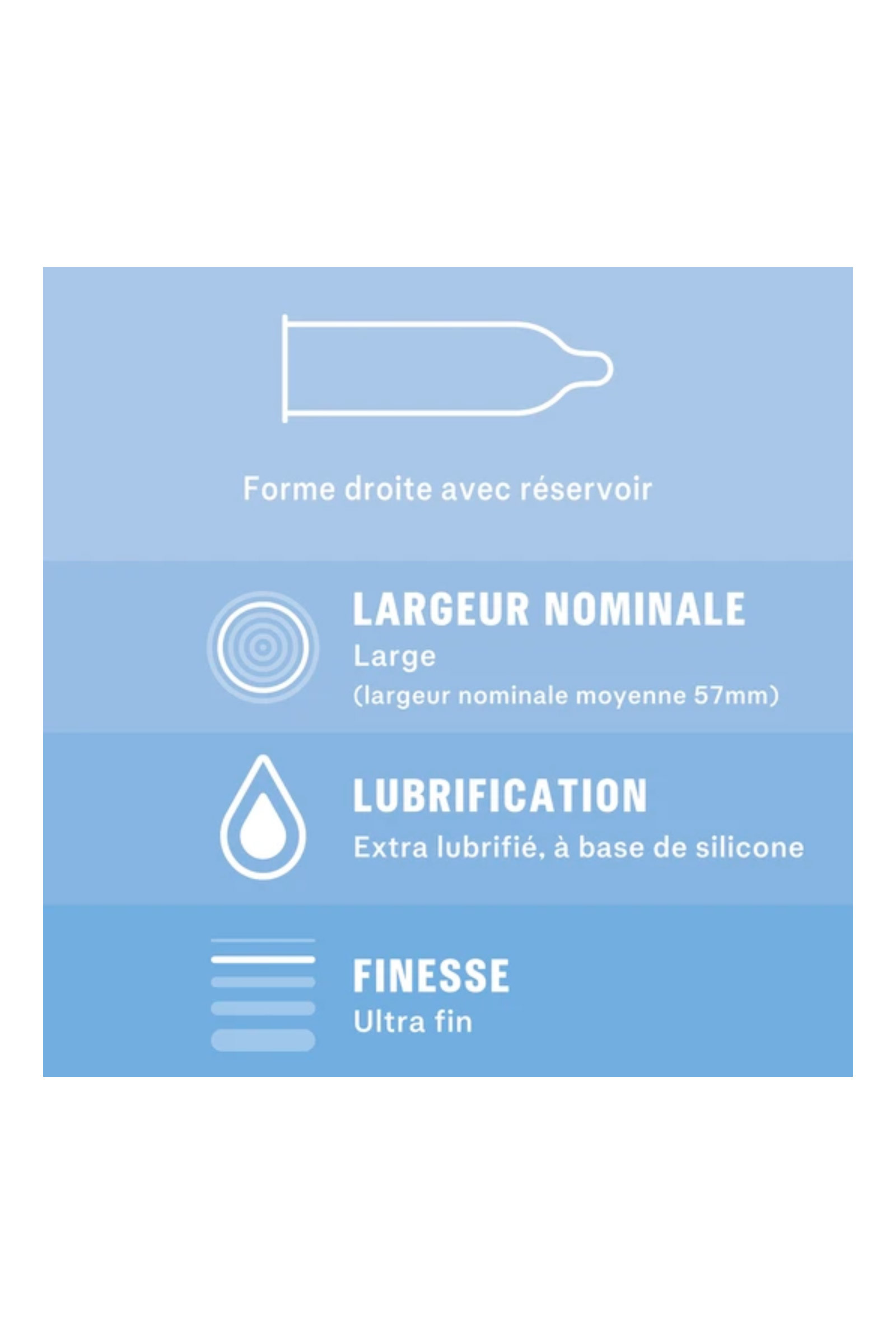 Spécialement conçus pour un contact optimal, ces préservatifs, en boîte de 8, sont très fins.