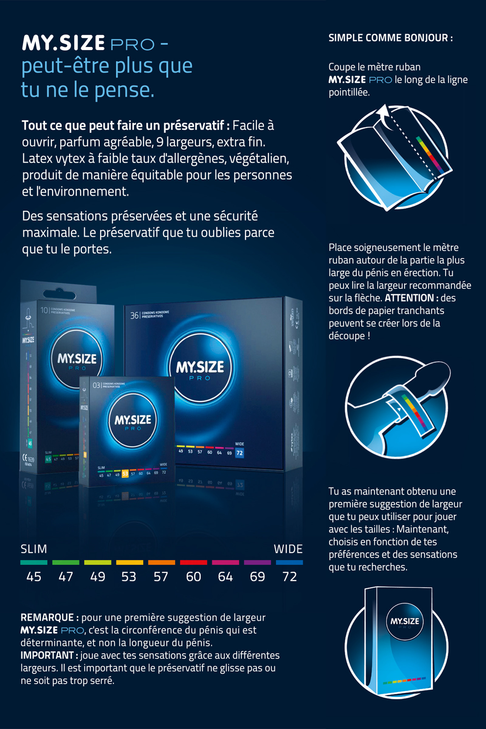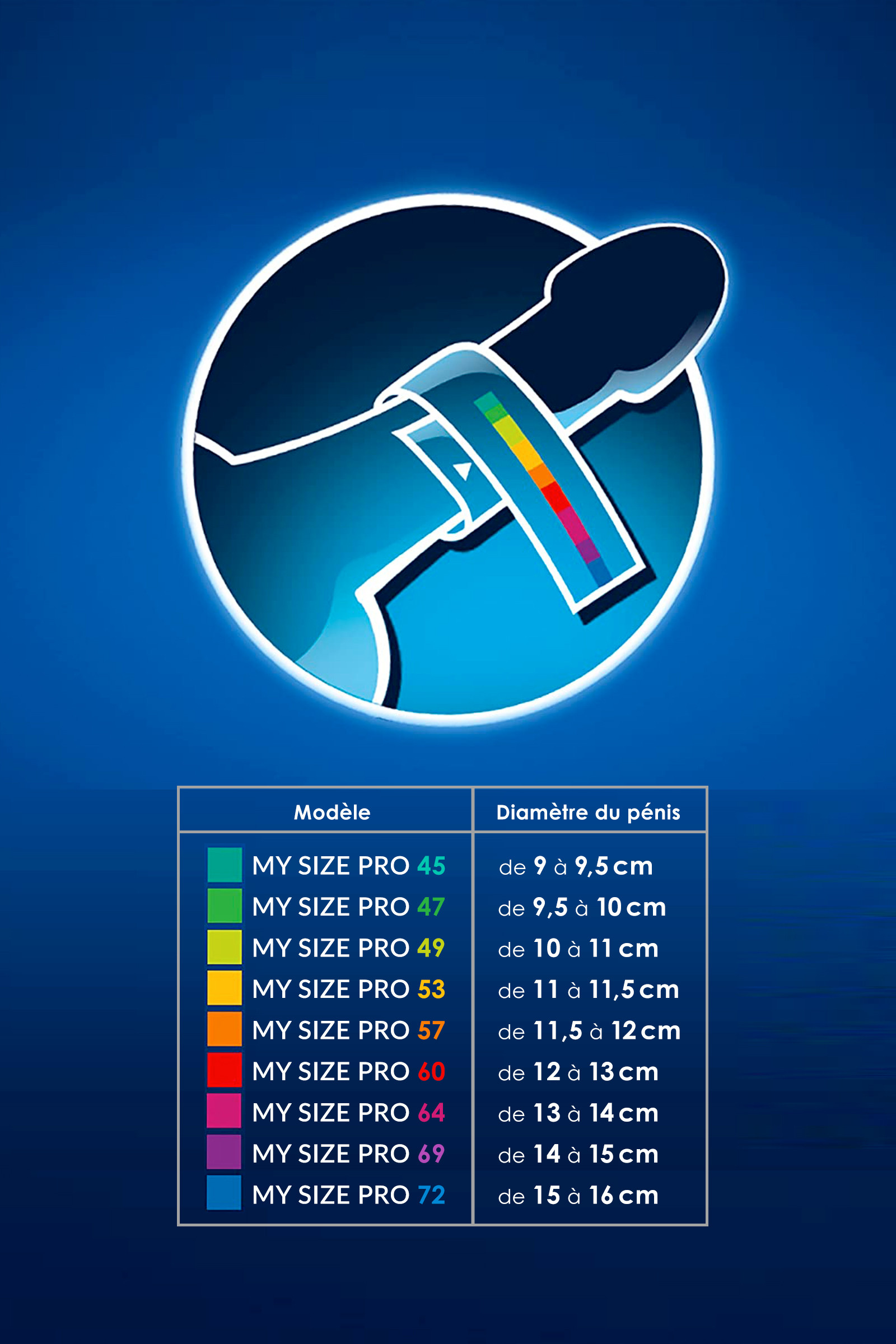 Trouvez votre taille idéale ! Les préservatifs My Size Pro propose une gamme complète avec plus de 9 largeurs de préservatifs allant de 47 mm à 72mm.
