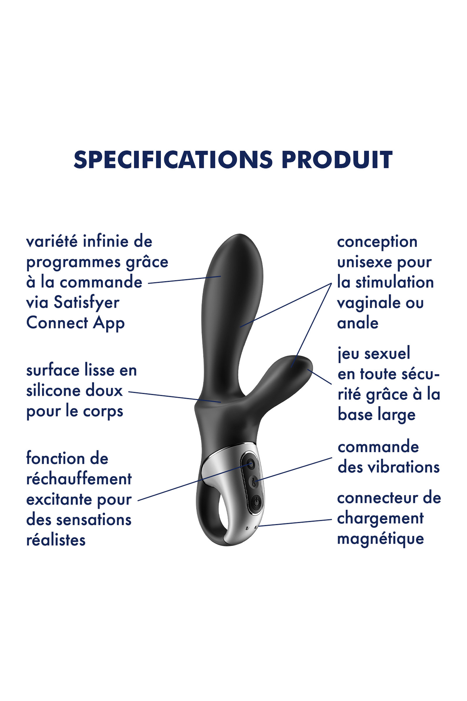Commandez votre Heat Climax + à distance avec l'application Satisfyer , disponible dans l’App Store & Google Play. Personnalisez vos vibrations à l’infini pour des moments d’extase inoubliables. Pensez à bien nettoyer et désinfecter le vibromasseur si vous souhaitez l’utiliser par voie vaginale après une stimulation anale.Fabriqué en silicone ultra doux et hypoallergénique de qualité supérieure, le vibromasseur “Heat Climax” + vous garantit une expérience 100% respectueuse pour votre corps. Envie d’un petit plaisir sous la douche ? Le Vibromasseur “Heat Climax” + est waterproof (IPX7).